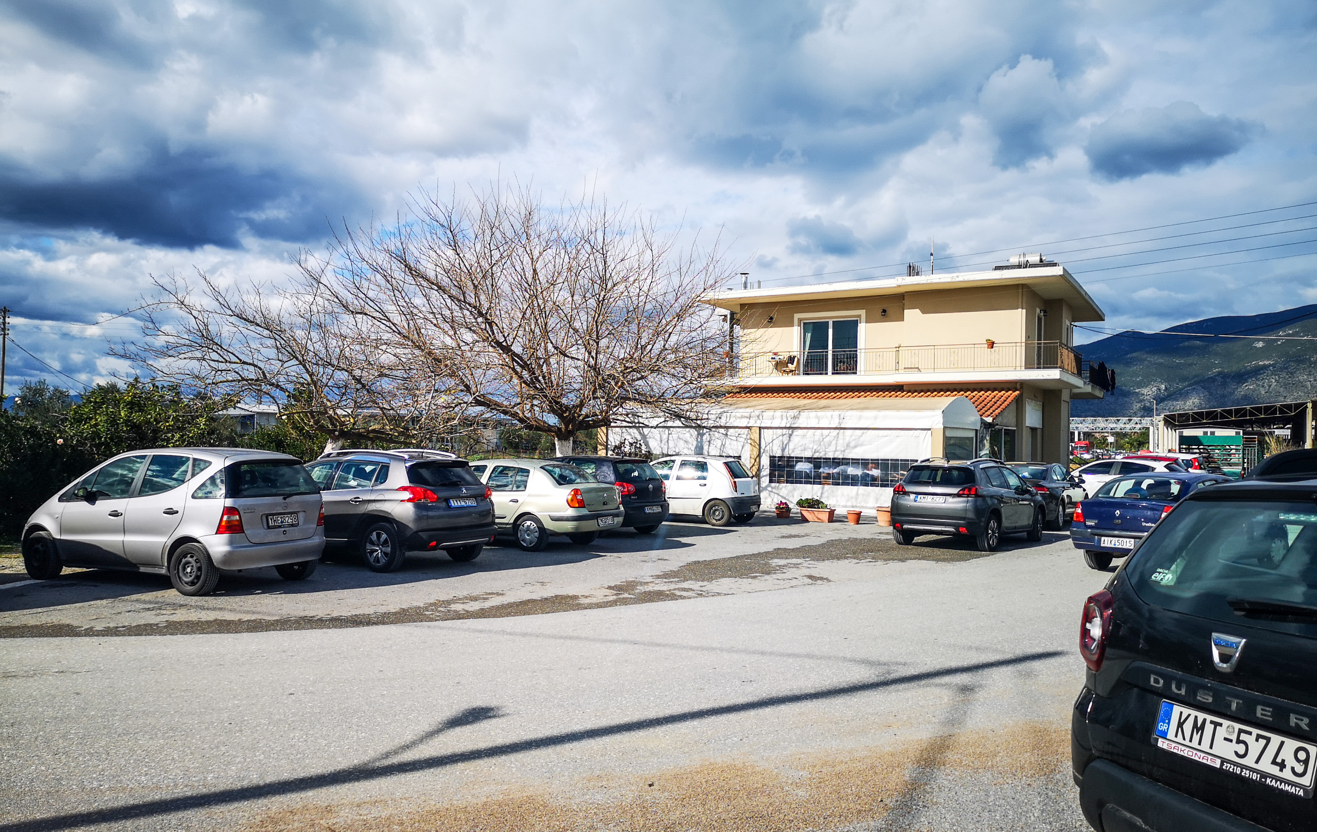 Efter besök på Jumbo, telefonbutiken, kaffe och plantskola var det dags för lunch. Vi hamnade som så många gånger förut på tavernan ”Costas” Vassiliadis. Det är ett otroligt populärt ställe som man måste veta om för att hitta till. Det ligger inklämt mellan åkerlappar och småindustrier i Kalamatas utkant. Är ni i närheten så passa på att besöka stället. Men kom på dagen för på kvällen har de inte öppet.