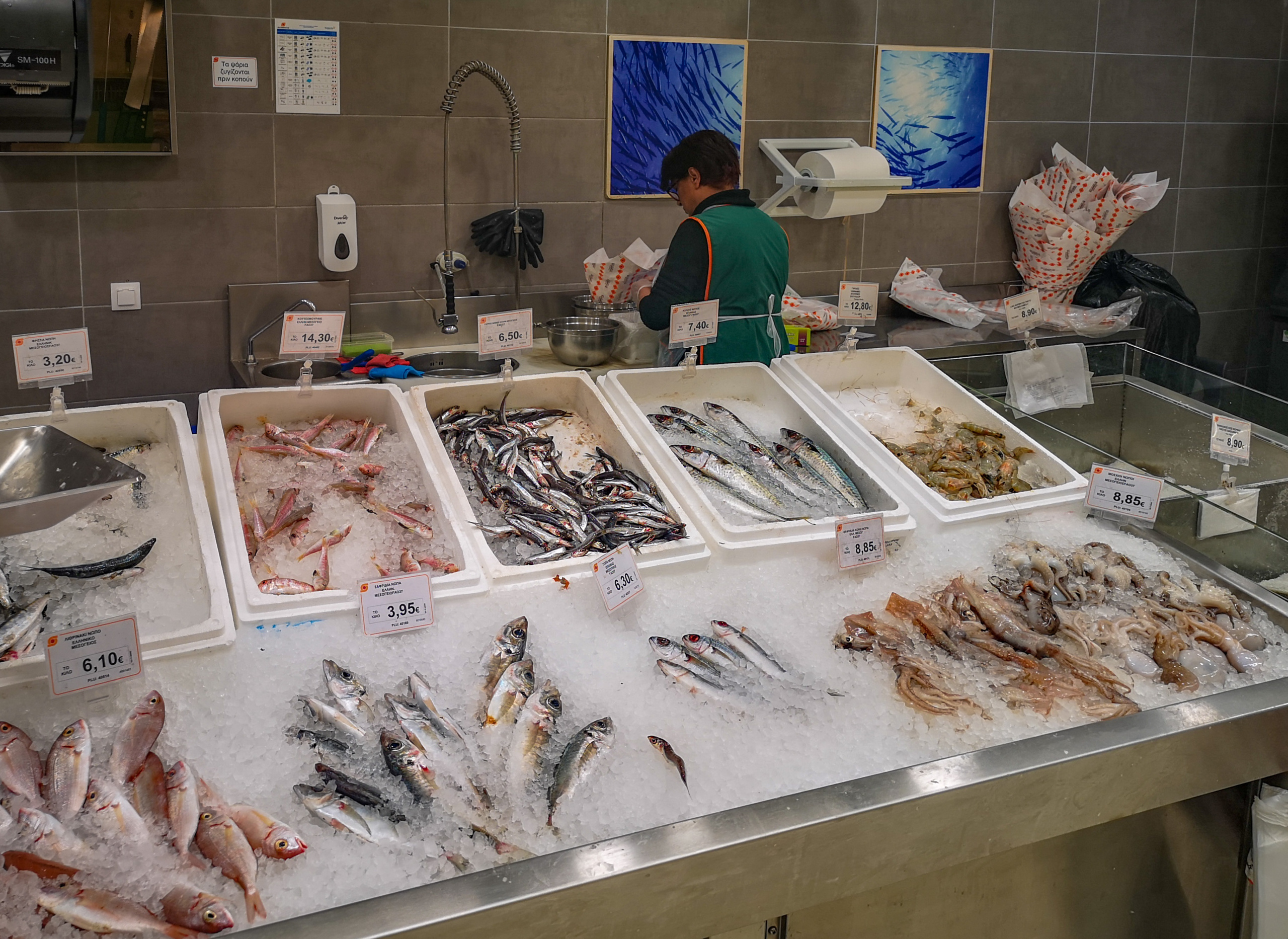 Därefter var det dags för livsmedelsinköp. Vi kör nästan alltid samma runda. Först Lidl som är både är billigt och dessutom har en hel del som annars inte är så lätt att få tag på i Grekland. Därefter blir det alltid Sklavenitis. Där är det chark-, ost- och fiskdiskarna som lockar – och att butiken är rymlig, fräsch och trevlig med ett mycket brett sortiment. Att man kan köpa världens godaste mjukglass där för nästan ingenting ökar förstås dragningskraften ytterligare.